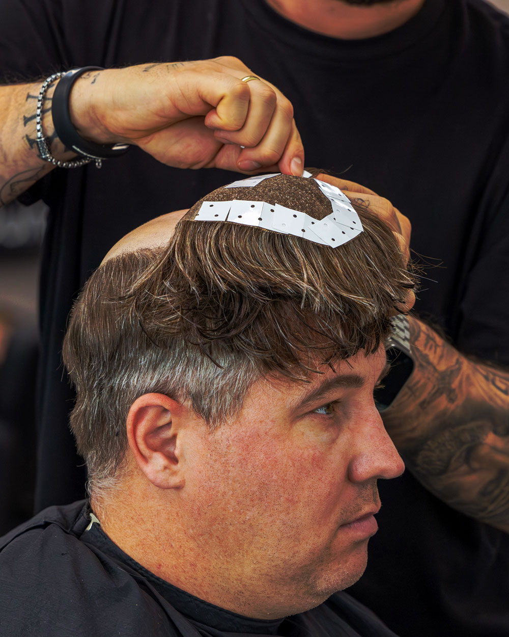 Bei jedem Termin führe ich eine vollständige, schonende Reinigung und Neu-Montage durch. Dazu gehören das sorgfältige Abnehmen des Haarsystems, das Entfernen aller Kleber- und Tape-Rückstände, die gründliche Reinigung und Pflege des Systems sowie die Vorbereitung deiner Kopfhaut. Anschließend befestige ich dein Haarsystem präzise neu – für optimalen Halt und einen frischen, natürlichen Look.
